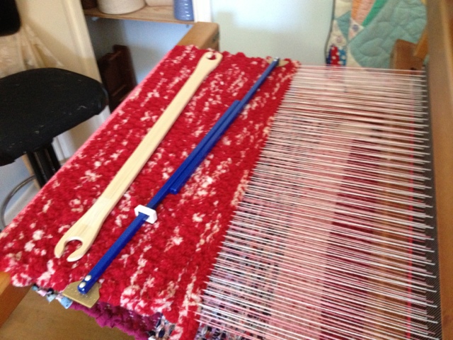We have tied on a new warp for dish towels. They are made with 8/2 cotton yarn. Still working on the chicken track rugs using some fleece fabric. There are a lot of dust bunnies under the loom, hopefully they will be better when they are done. I am using my iPhone and it is so difficult to type on, I don't know how people with fat fingers can do it.